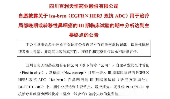 2025年11月21日,国家药监局药品审评中心(CDE)正式受理了百利天恒研发的双抗ADC药物iza-bren(BL-B01D1)用于治疗局部晚期或转移性鼻咽癌的上市申请。